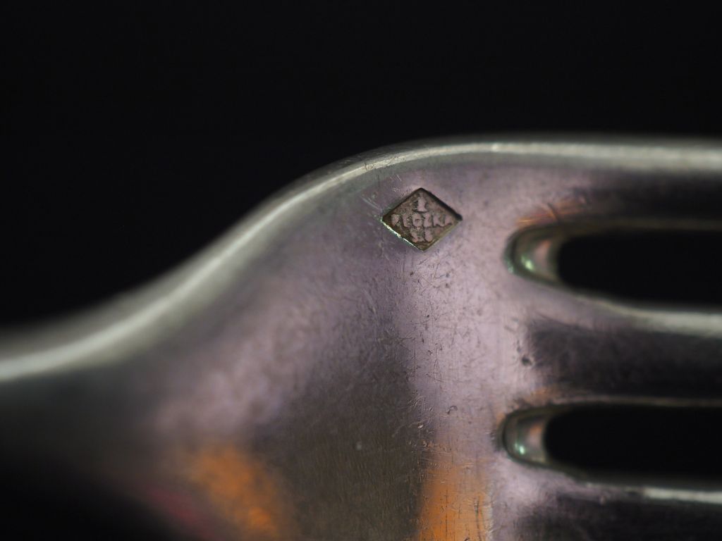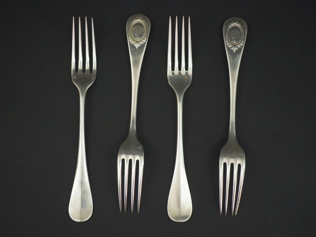 Suite de trois grandes fourchettes de style Louis XVI en argent, poinçon Minerve, modèle à cartouche monogrammé. On y joint une grande fourchette en argent, poinçon Minerve, modèle à cartouche monogrammé. Poids. 333 g