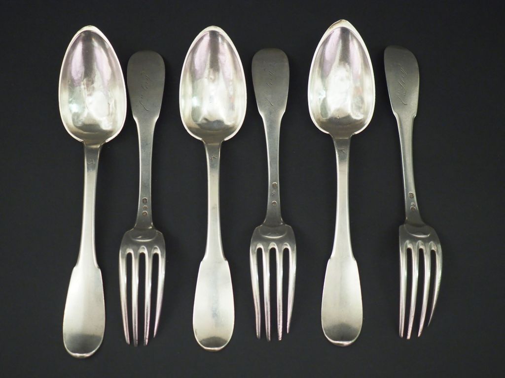 Suite de trois grands couverts Restauration en argent, poinçon Vieillard, modèle uniplat. Marqués. Poids. 404 g