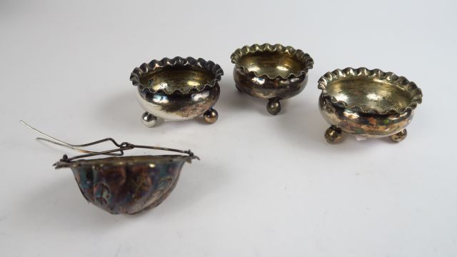Suite de trois salerons et passette à thé en argent