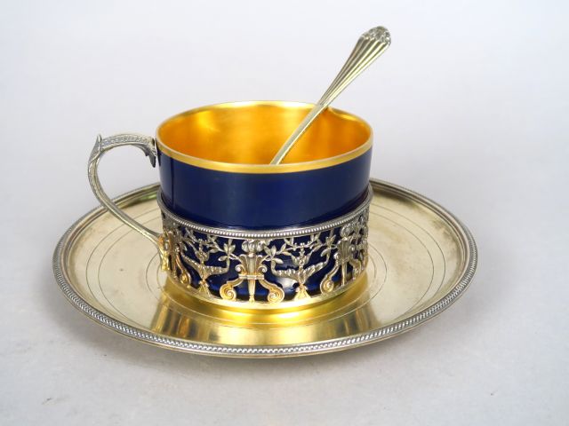 Tasse en porcelaine de style Louis XVI, monture et sous tasse en vermeil, poinçon Minerve. On y joint une cuillère en vermeil. Poids sans la porcelaine : 263 g