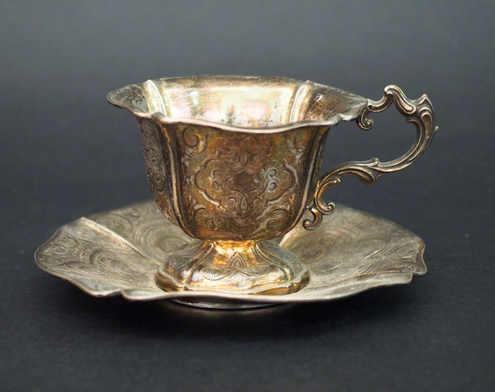 Tasse et sa sous-tasse de style rocaille en argent, poinçon Minerve, à décor d'entrelacs. Poids.146 g