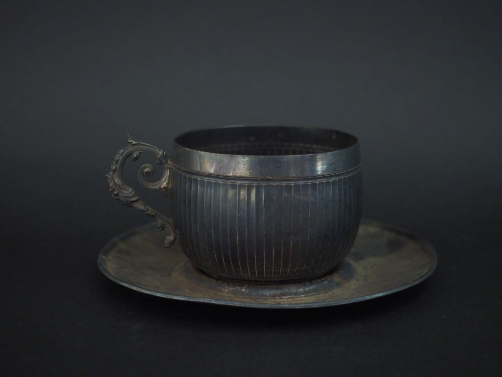 Tasse et sa sous-tasse en argent 925, poinçon Minerve, à décor de cannelures. H. de la tasse : 7 cm Diam. de la sous-tasse : 16,5 cm Poids. 298 g (sous-tasse légèrement tordue à un endroit)