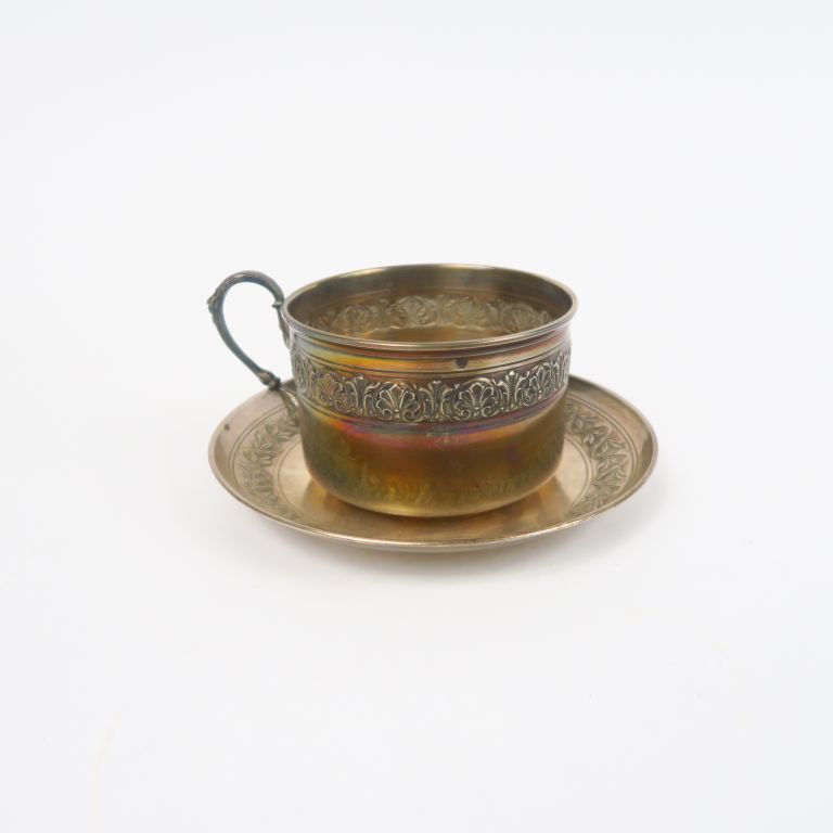 Tasse et une sous-tasse en argent, poinçon Minerve, à décor de frises de feuillage. Poids. 210 g