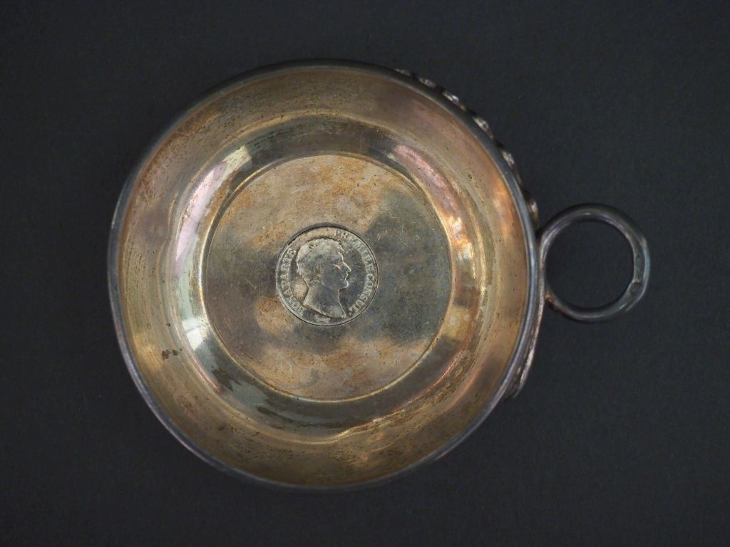 Taste vin en argent, poinçon Minerve, à décor en son centre d'une pièce de 1 Franc figurant Bonaparte Premier Consul. La anse, à décor de serpent. Diam. 9 cm Poids. 161 g