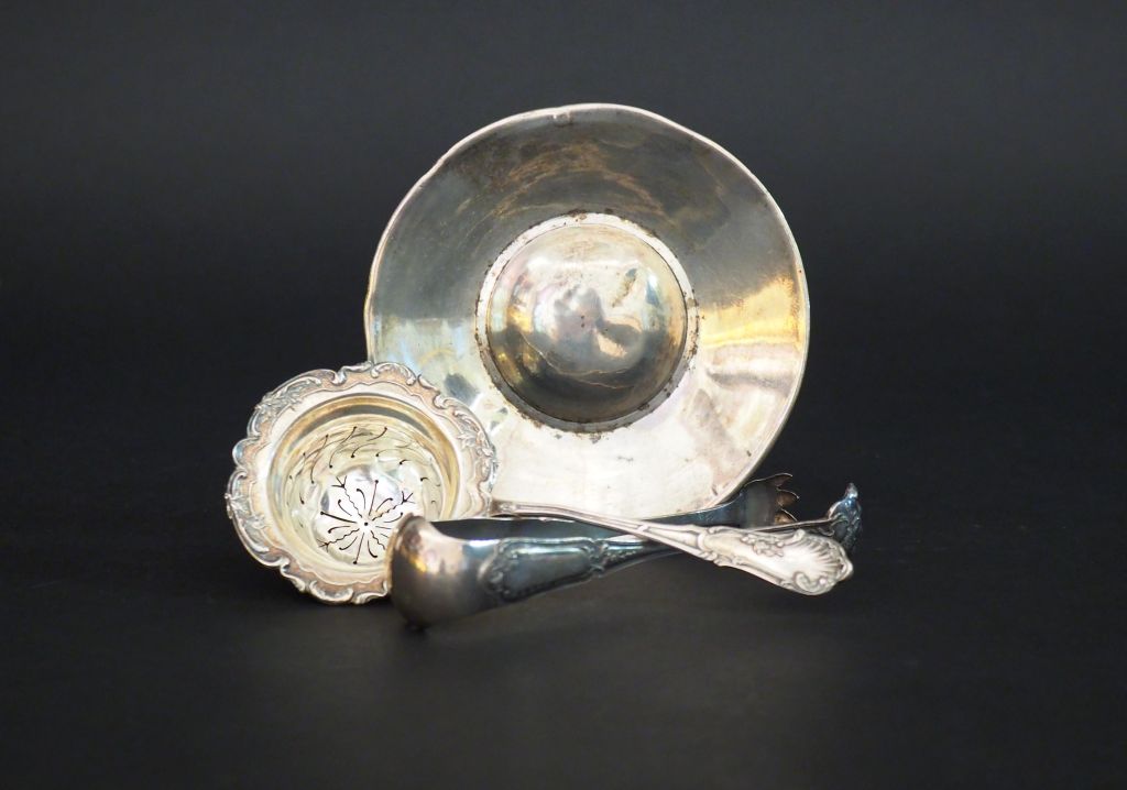 Taste vin en argent, une pince à sucre en argent poinçon Minerve, une passette à thé Napoléon III en argent poinçon Minerve. Poids : 122 g