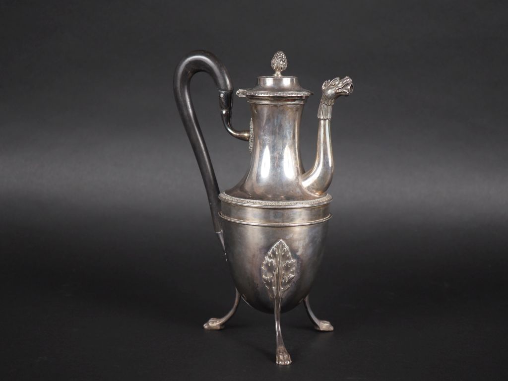 Théière fin XVIIIème - début XIXème en argent 950, poinçon au 1er Coq, à décor de frises de palmettes. Reposant sur trois pieds griffes. Attaches feuillagées. Bec verseur en forme d'animal. Prise du couvercle en forme de pigne. Manche en bois. H. 24 cm Poids tel. 619 g