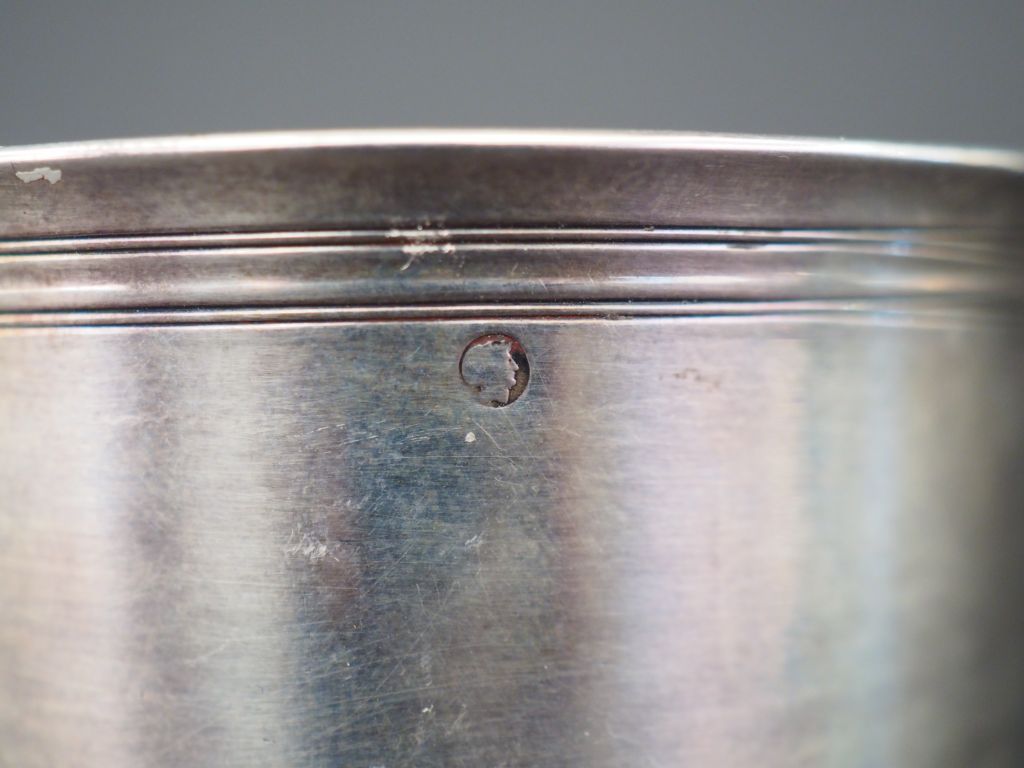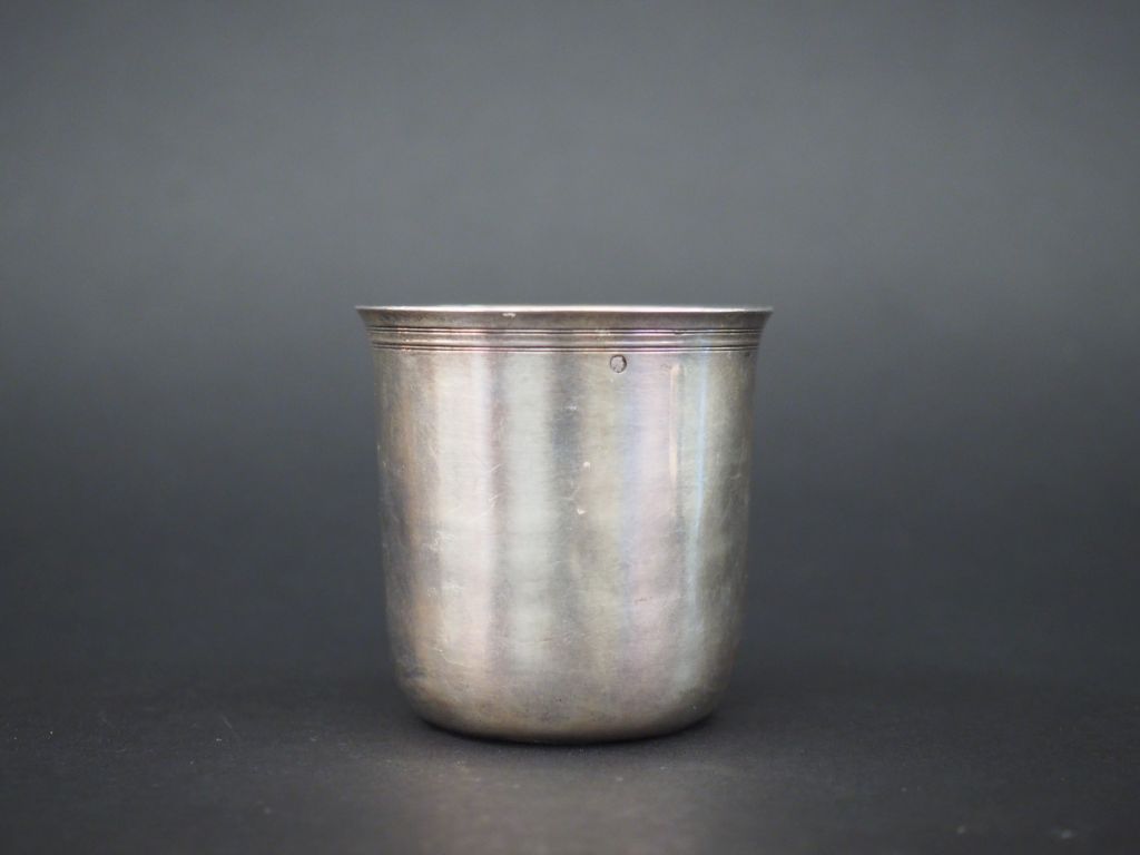 Timbale à bord évasé en argent, poinçon au coq, à décor de filets. H. 6,5 cm Poids. 48 g