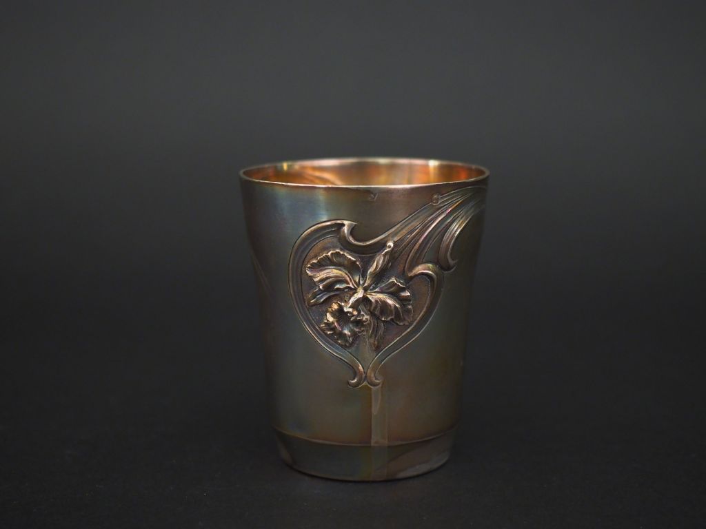 Timbale de style Art Nouveau, à décor au repoussé d'iris. Poids. 7,5 cm Poids. 97 g