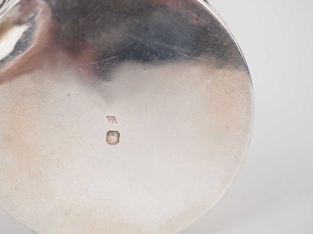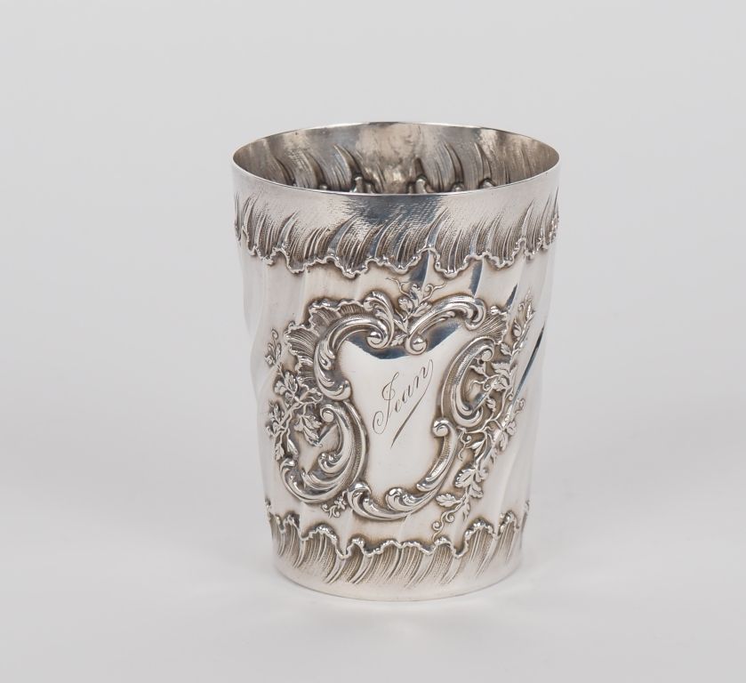 Timbale de style Louis XV en argent 925, poinçon Minerve, à décor de cartouche rocaille fleuri et de peigné. Gravée "Jean" H. 8,7 cm Poids. 112 g