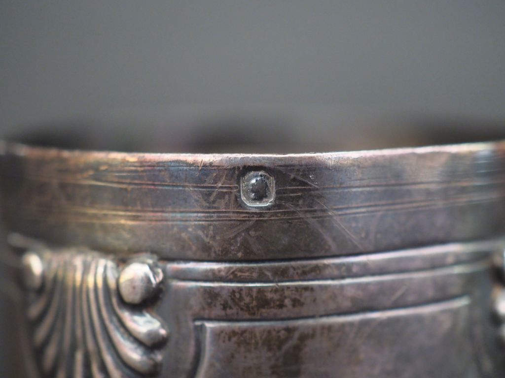 Timbale de style Louis XV en argent, poinçon Minerve, à décor de coquilles et de fleurons. H. 7,5 cm Poids. 80,73 g (enfoncements)