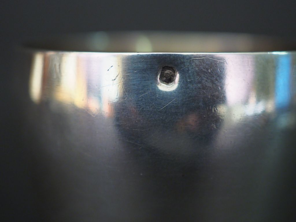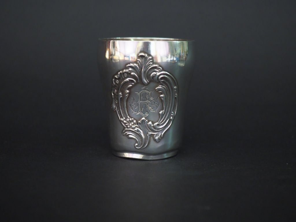 Timbale de style Louis XV en argent, poinçon Minerve, à décor de monogramme dans un cartouche rocaille. H. 7,5 cm Poids : 91 cm (petits enfoncements)