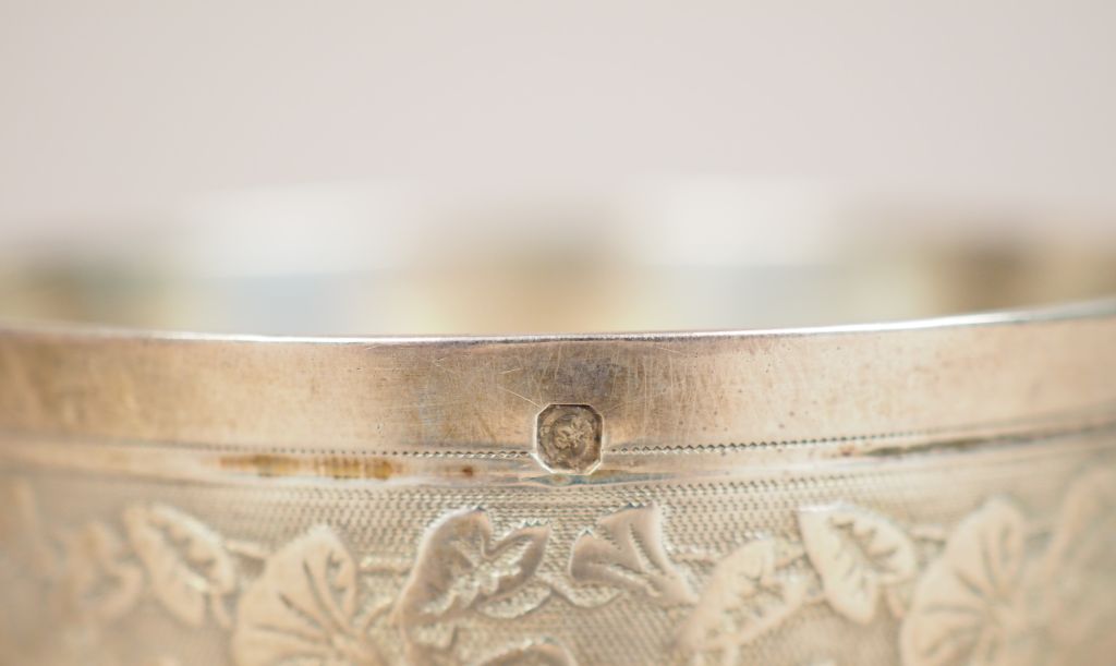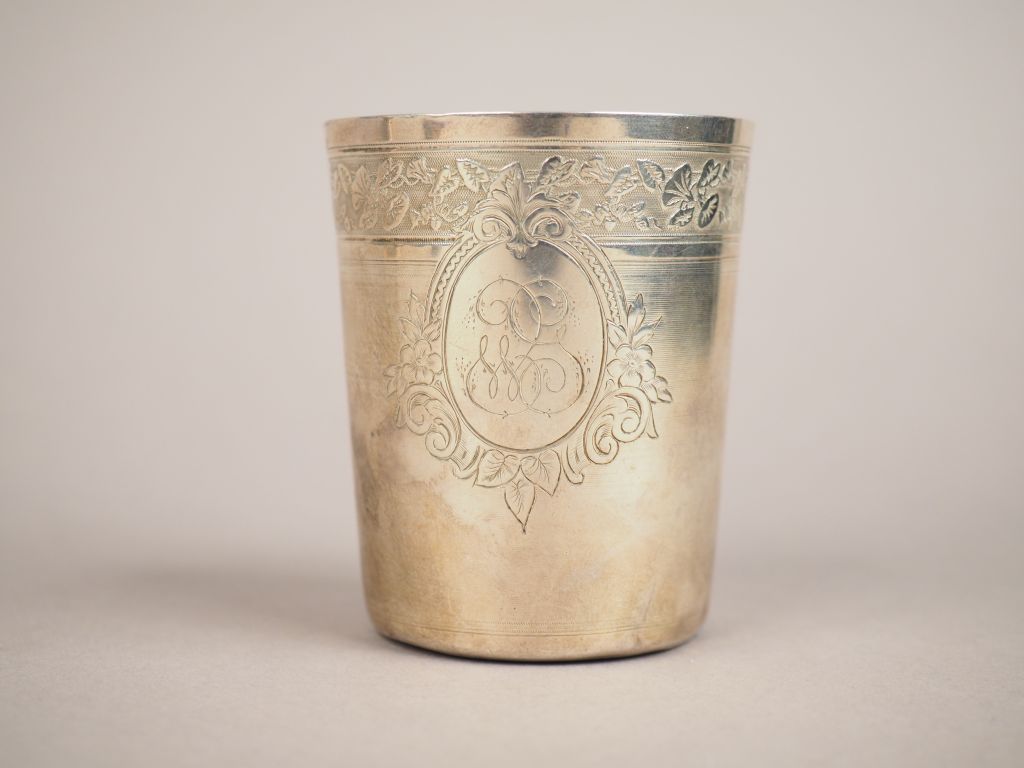 Timbale en argent, poinçon Minerve, à décor d'une frise de feuillage et d'un monogramme dans un cartouche feuillagé. H. 8,5 cm Poids. 102 g