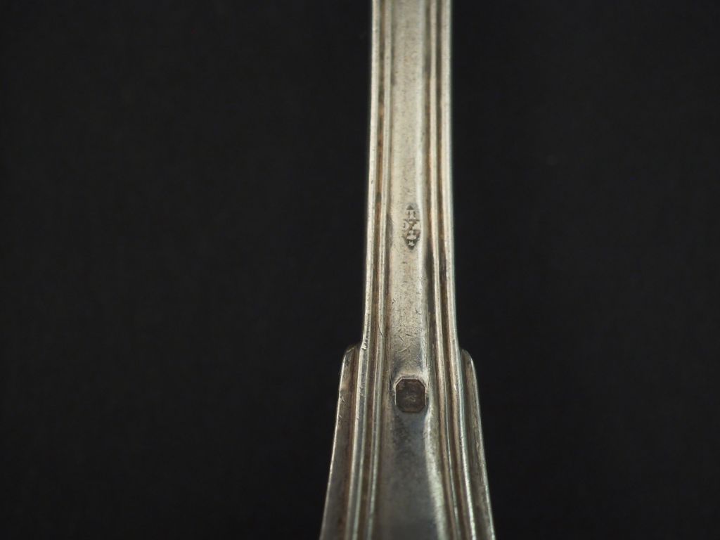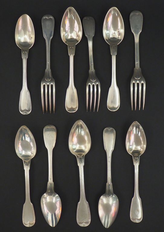 Trois grands couverts et cinq cuillères en argent, poinçon Minerve, modèle à filet. Poids. 812 g (maitres orfèvres dépareillés)