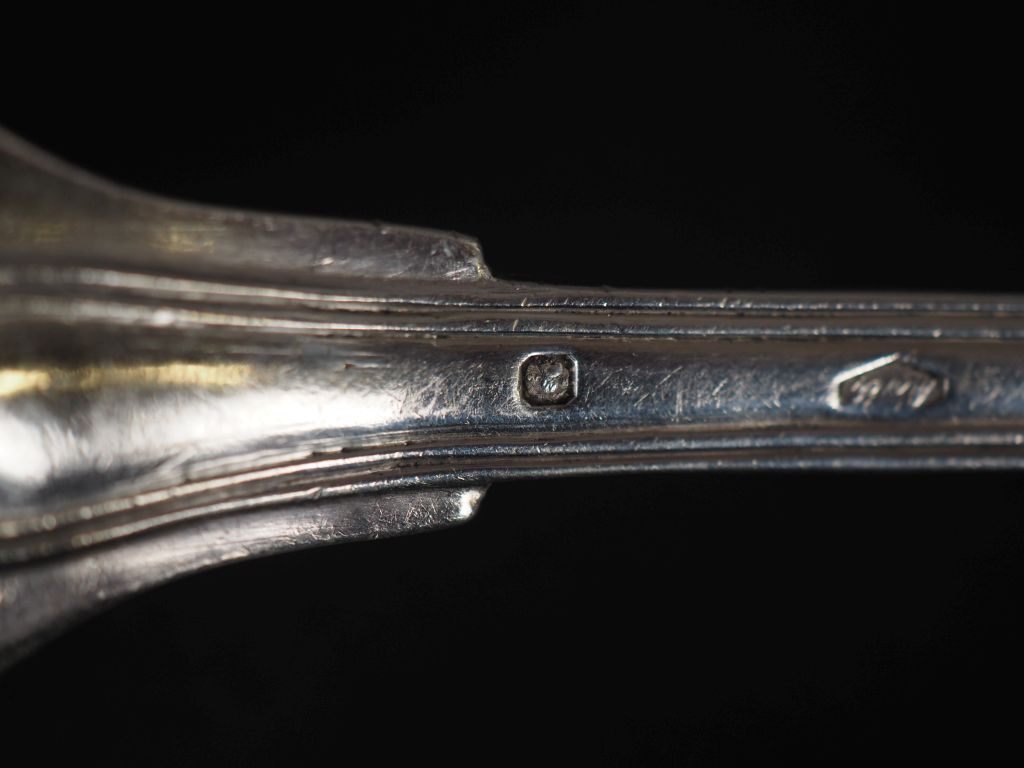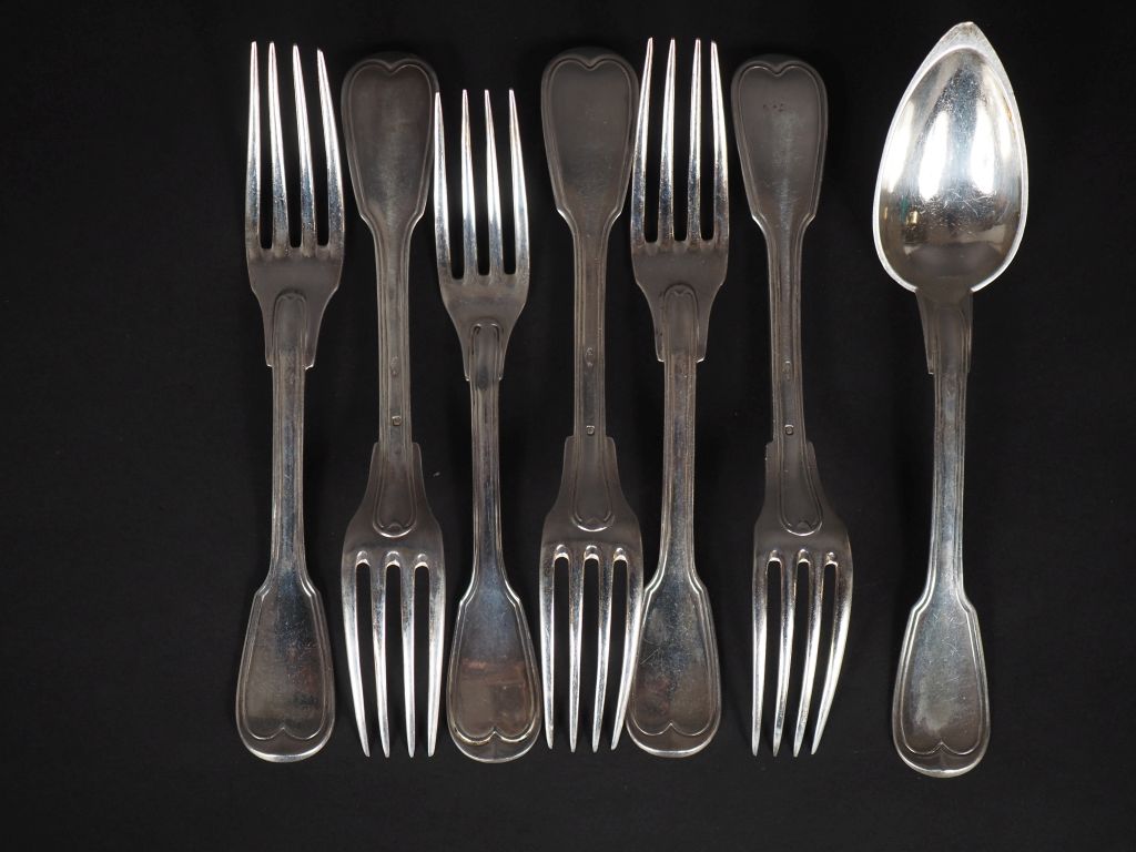 Un grand couvert et cinq fourchettes en argent 925, poinçon Minerve, modèle à filet. M.O : MOREL Poids. 607 g