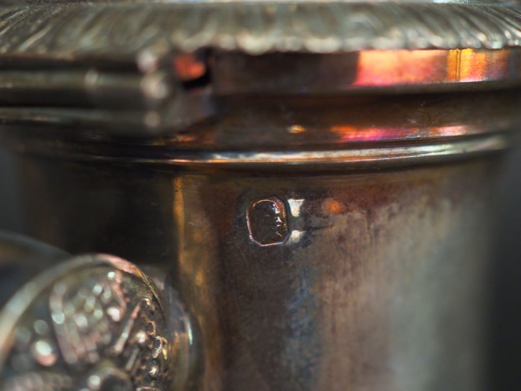 Verseuse à fond plat en argent, poinçon Vieillard. Bec verseur cannelé, couvercle à décor de frise de feuilles d'eau et prise en forme de pigne. Manche anciennement en bois noirci. H. 15,5 cm Poids tel. 208 g (usures au manche)