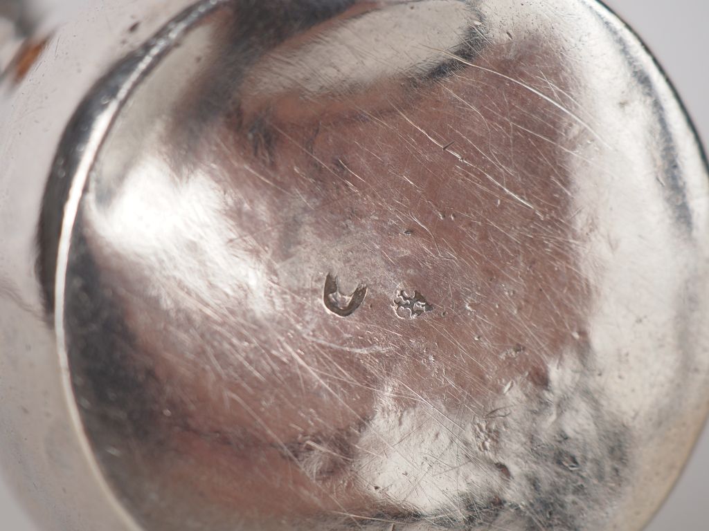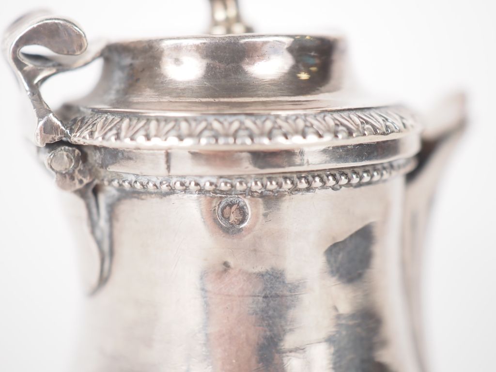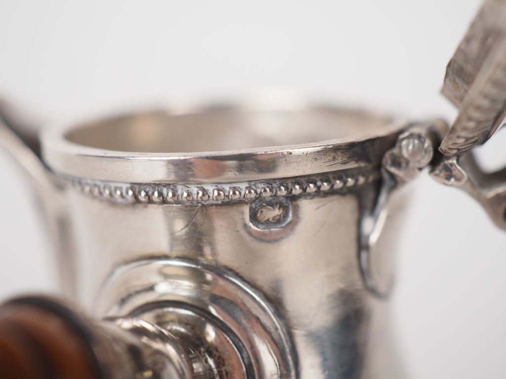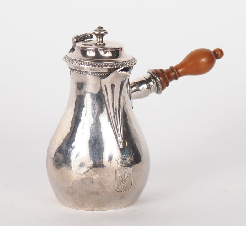 Verseuse égoiste en argent, poinçon Minerve, armoriée, manche en buis. Poids tel : 103 g (léger enfoncement)