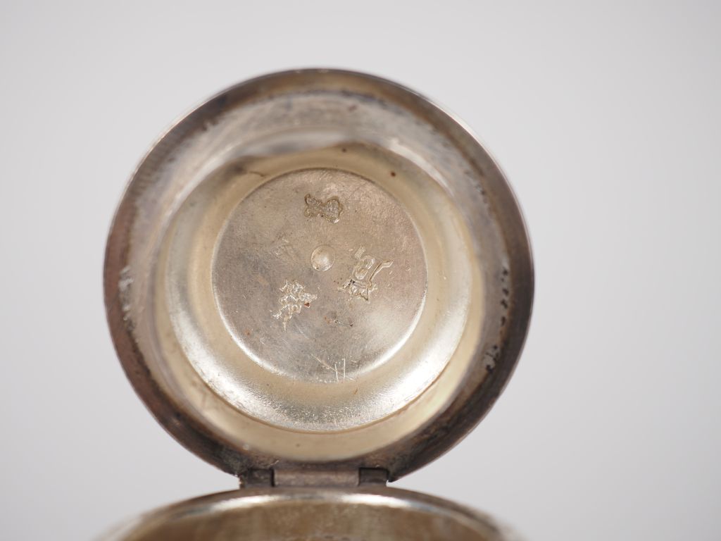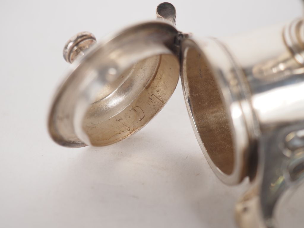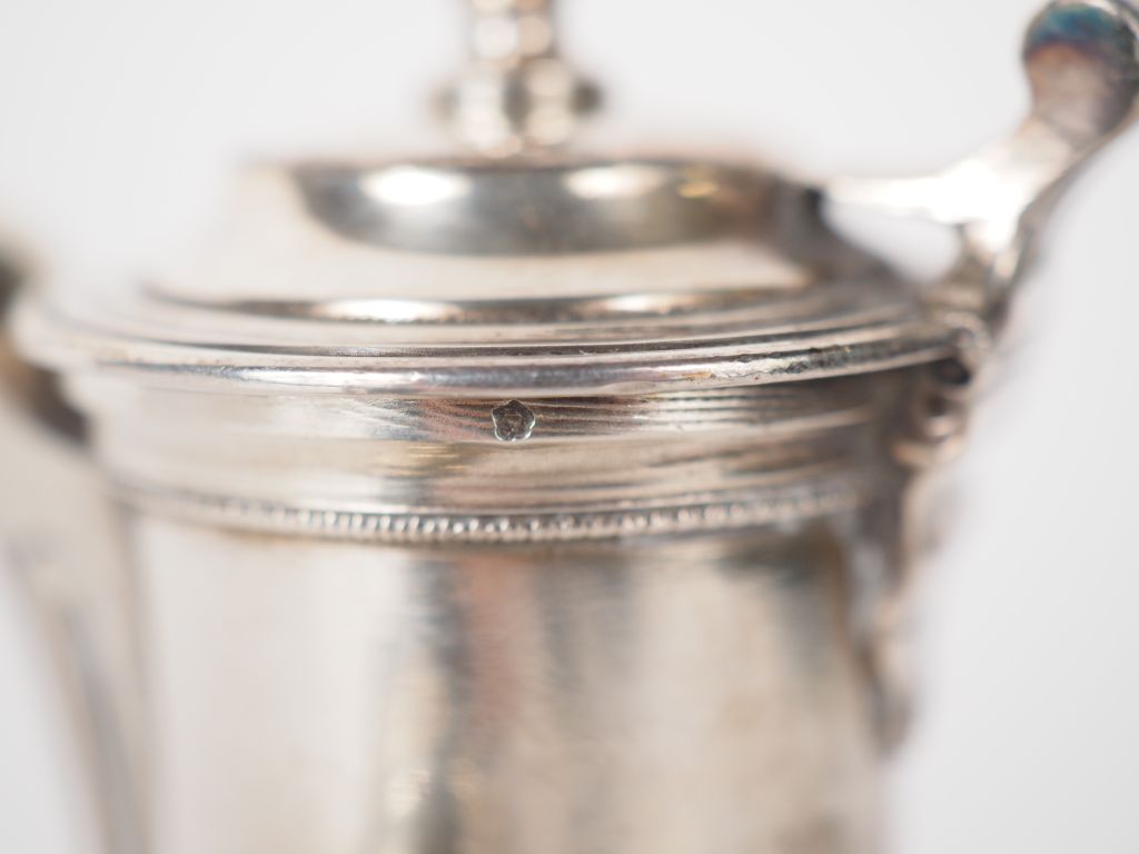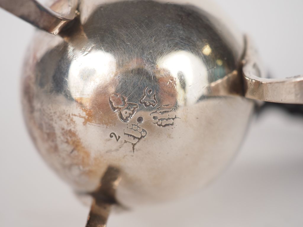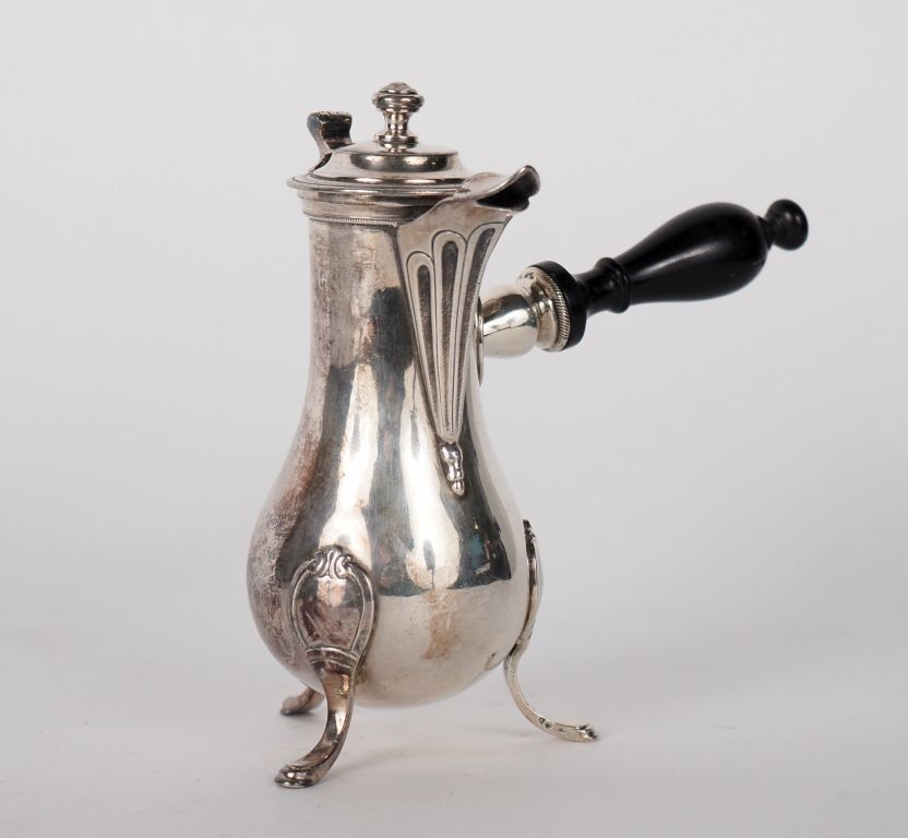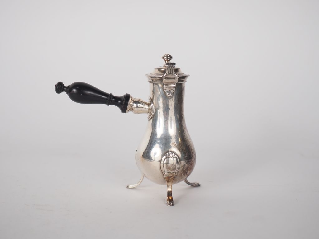 Verseuse égoïste tripode en argent XVIIIème, manche ébène Poids : 134 g (petit enfoncement au niveau du couvercle, poinçons du couvercle et du corps différents)