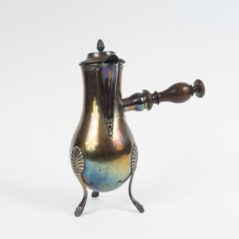Verseuse en argent, poinçon Vieillard, à décor de palmettes, reposant sur trois pieds griffe. Manche en bois. Poids (sans le manche). 725 g