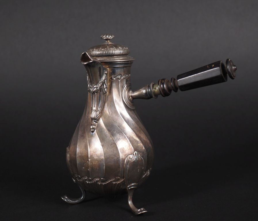 Verseuse tripode de style Louis XV en argent, poinçon Minerve, décor de côtes torses et de guirlandes, manche en ébène MO : Lapars à Paris Poids : 311 g tel