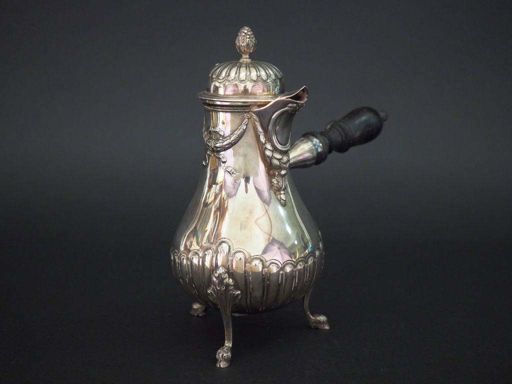 Verseuse tripode de style Louis XVI en argent, poinçon Minerve, à décor de godrons, nœuds de ruban et guirlandes de feuilles de laurier. Reposant sur trois pieds terminés en sabot de biche. Prise du couvercle en forme de pigne. Manche latéral en ébène. M.O : Lappar H. 19,5 cm Poids. 335 g