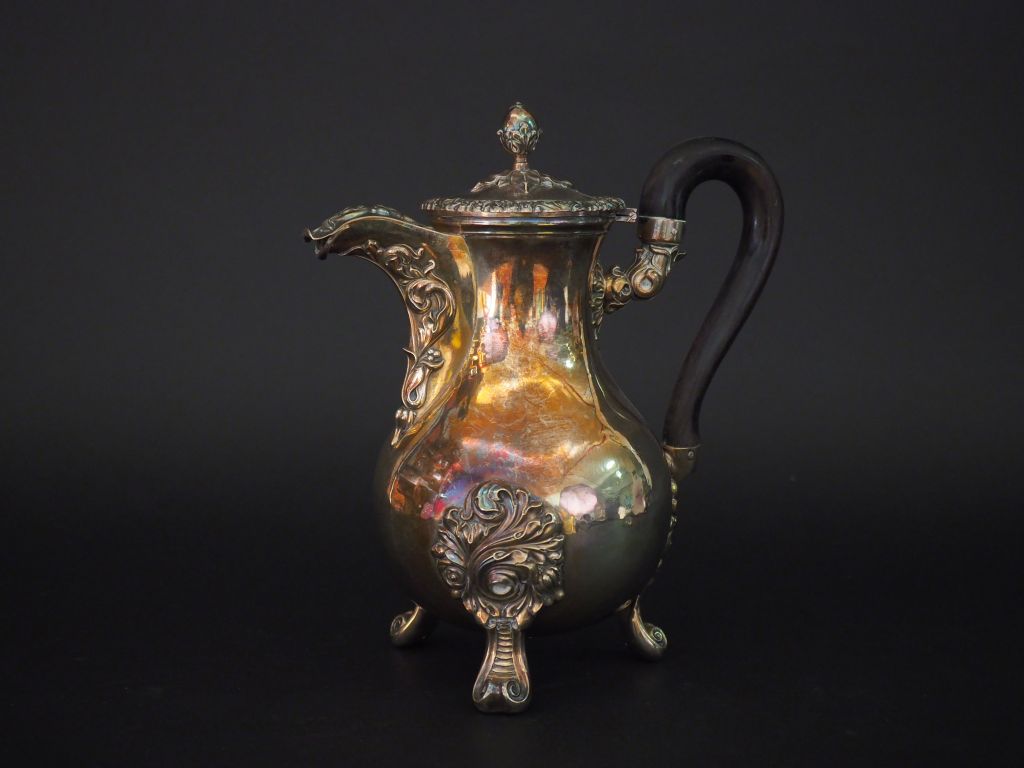Verseuse tripode Napoléon III en argent, poinçon Minerve à décor de feuillage. Prise du couvercle en forme de gland, pieds à enroulement. Anse en bois noirci. H. 25 cm Poids tel. 670 g