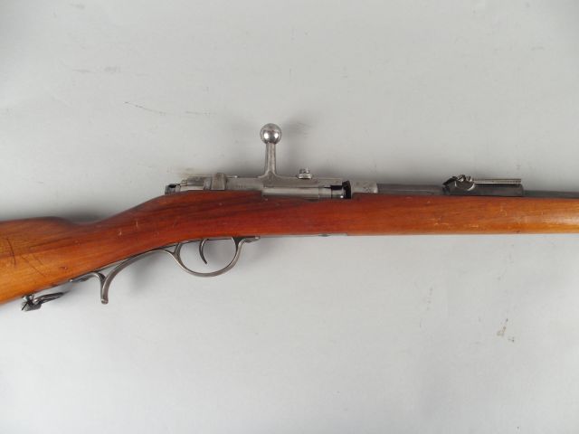 148- Fusil réglementaire Allemand de chasseur modèle 1871 calibre 11 mm Mauser fabrication arsenal de « Dantzig » en 1880, Culasse au numéro, pontet à repose doigt, baguette, belle monture en noyer clair, très bon canon. (1-) Catégorie «D2» (vente libre)