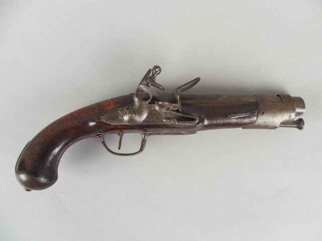 231- Pistolet à silex de demi arçon révolutionnaire façon gendarmerie, arme montée fer, embouchoir double bande monté à épinglette, chien à espalet, calotte à courte queue, arme vierge de marquages, baguette fer à canal découvert, monture en noyer. (1-)