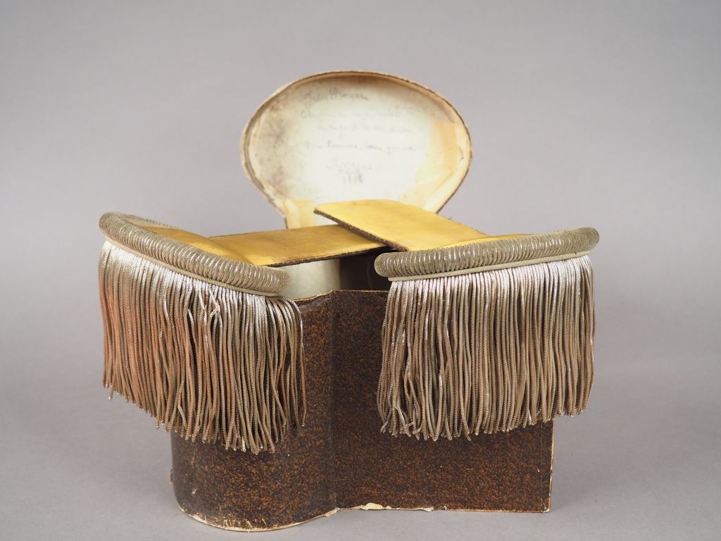 Belle boite en cartonnage brun contenant une paire d’épaulettes d’officier d’infanterie Second Empire, épaulettes à attente dorée, grosse tournante surlignée d’une tournante étroite, franges libres dorées. Etat 1-
