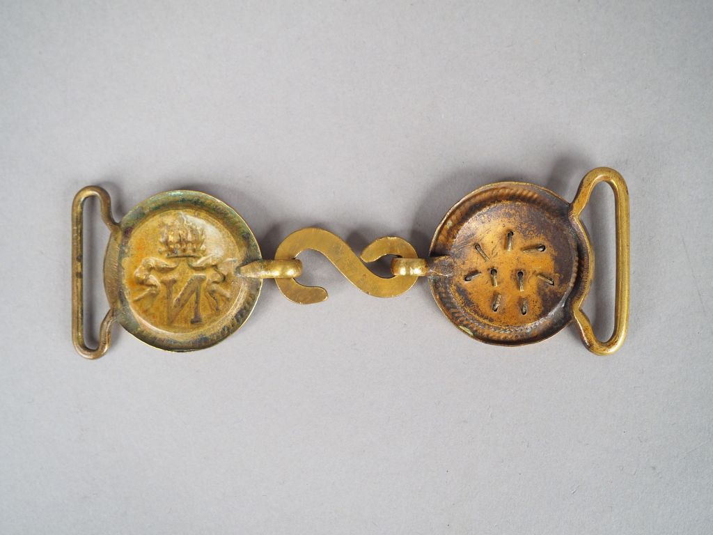 Belle boucle agrafe de ceinturon porte épée d’officier supérieur Second Empire. Deux boucles rondes en laiton doré « N » couronné en relief crochet serpentiforme. (Grenadier où voltigeur) Etat 1