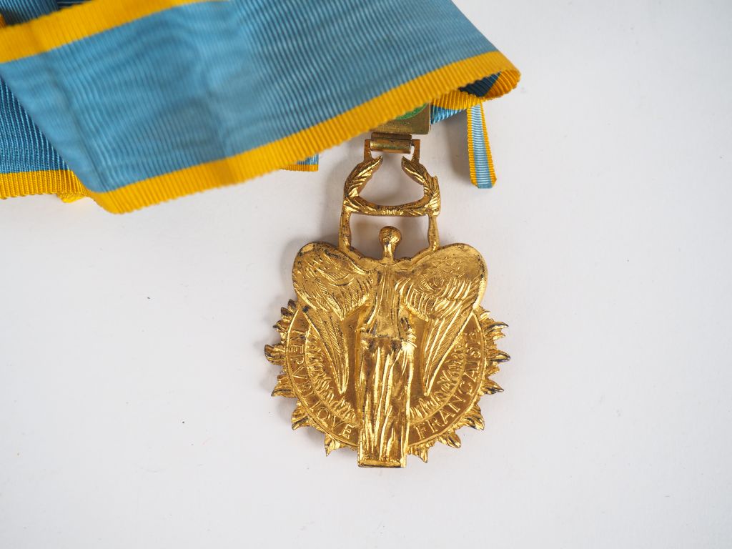 Belle cravate avec son bijou de commandeur de l’ordre du mérite sportif avec sa cravate bleu pâle à deux raies jaunes.Bronze doré et émail biface. (Etat 1)