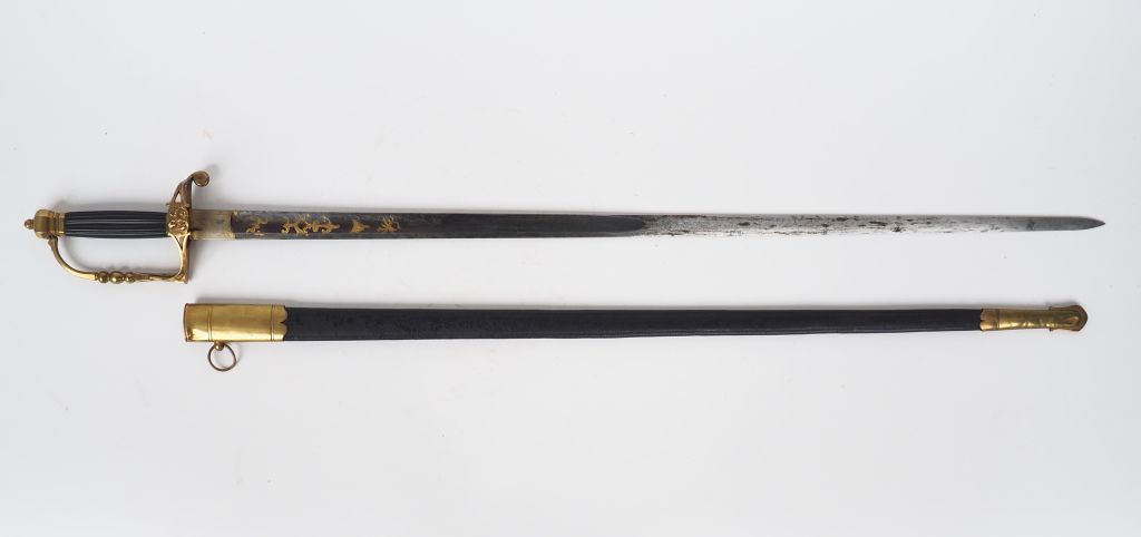 Belle épée d’officier début XIXe – lame droite dos plat au demi – deux gorges au demi portant les traditionnelles gravures de trophées d’armes et volutes de feuillages, cette moitié retient encore le bleu d’eau - le faible de la lame est de section lenticulaire et polie e balnc – monture en bronze doré – pommeau à courte queue à facettes et bouton de rivure proéminent – branche de garde unique à décore perlé au centre joignant à angle droite la croisière de garde – quillon n plat enroulé vers l’avant – court plateau de contre-garde ovale à décore léonin – fusée galbée à 4 pans en ébène strié dans son fourreau cuir à deux garniture laiton et découpe en accolade – état 1