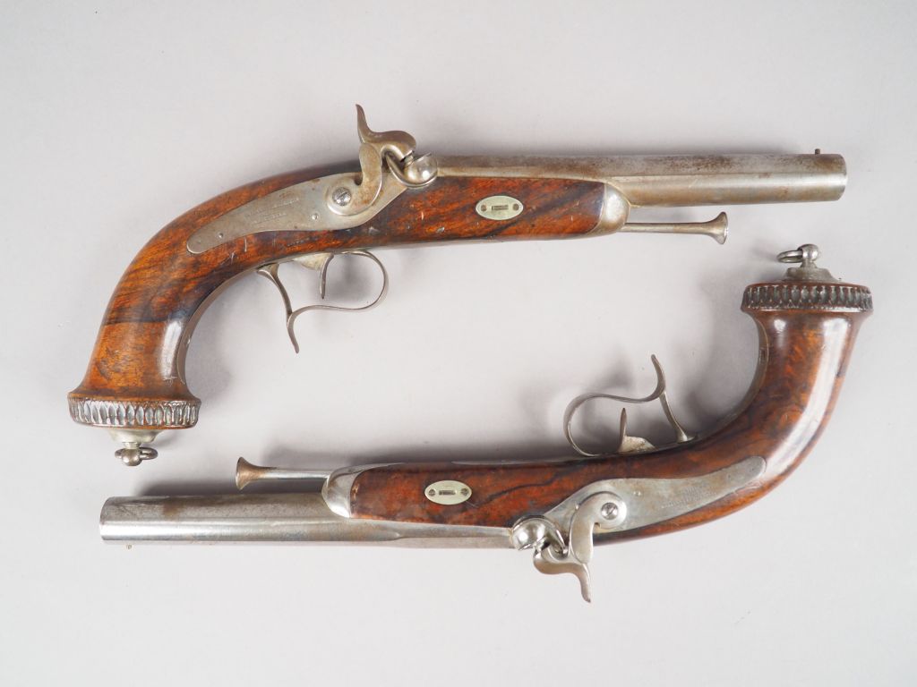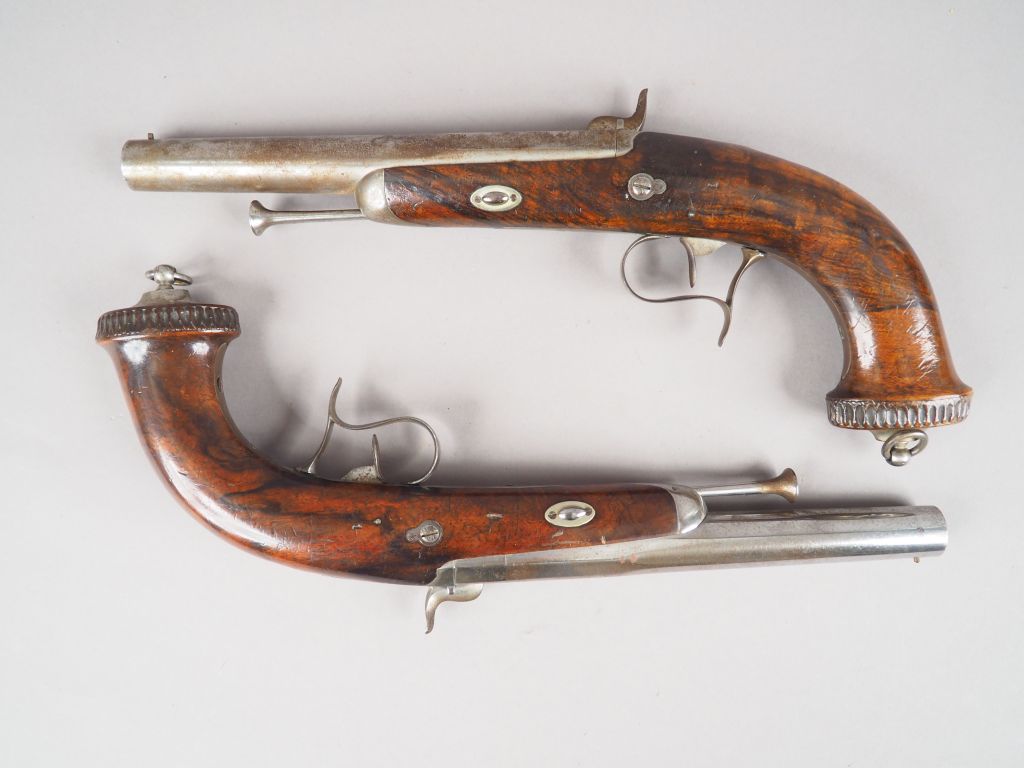 Belle et robuste paire de pistolets de combat à percussion et platines à l’arrière, signés sur ces dernières en lettres bâtons « Paliard Vialetton à St Etienne ». Armes montées fer, pontet à repose doigts, capuche fer ronde, baguette fer, tubes montés à tiroir, calotte ovale à anneau mobile. Canons octogonaux puis ronds en calibre 16 à la livre (17,5 mm) rayés profondément. Longueur totale 365 mm dont 200 mm de canon, monture en ronce de noyer lisse avec feston gravé surlignant discrètement la calotte de crosse, discrète pièce de pouce en argent losangique portant la lettre « B ».Armes contemporaine de la conquête de l’Algérie en calibre dit de munition pour l’usage d’un officier. Mécanisme fonctionnel, arme de catégorie « D » Etat 1