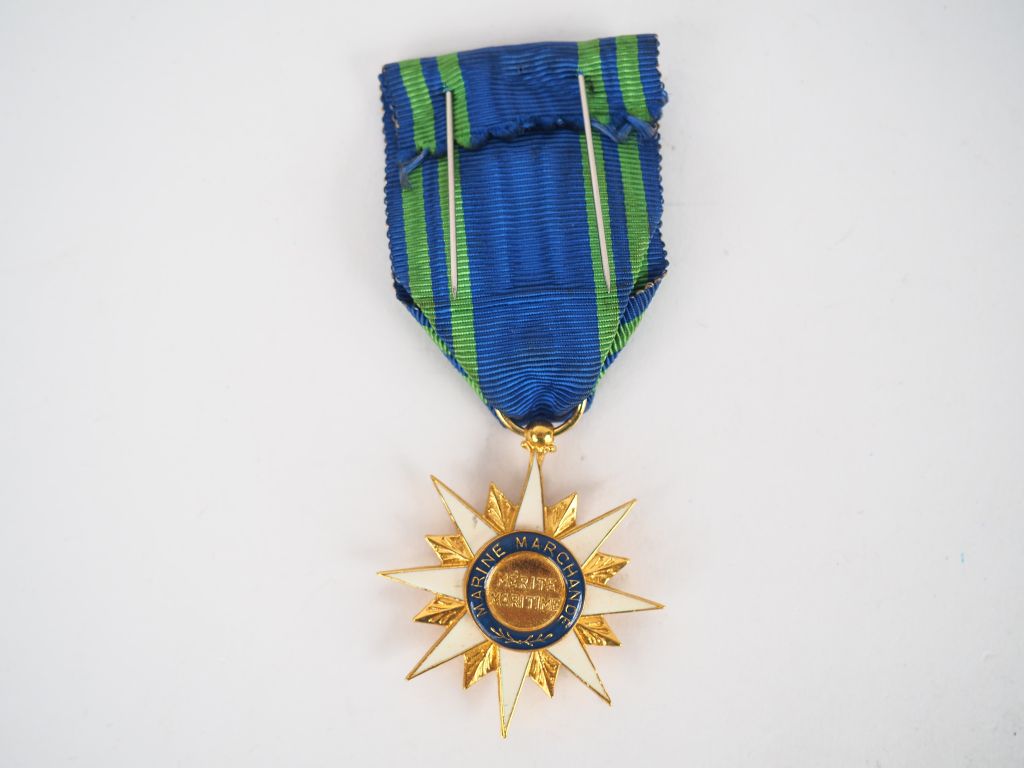 Belle étoile dorée d’officier du mérite maritime (marine marchande) module biface à l’ancre et à l’étoile émaillée. Avec son ruban bleu et vert à bouffette. (Etat 1)