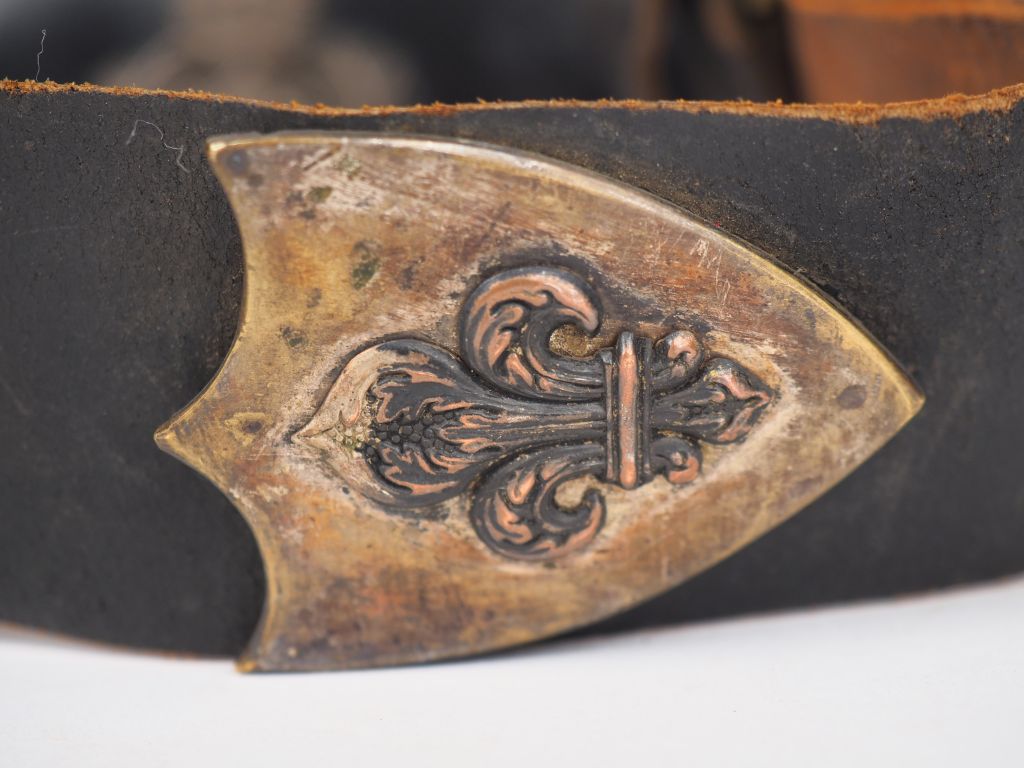 Belle giberne avec sa banderole, ensemble en cuir vernis noir face interne de la banderole en cuir fauve, coffret bois gainé de cuir noir, rabat en cuir noir ciré, un jonc en cuivre argenté habille et renforce le rabat, emblème central également en cuivre argenté embouti aux armes de France dans un écu à la française et couronnées entourées de feuilles de laurier, garniture de banderole au mufle léonin sur base rectangulaire à pan coupé, et belle fleur de lys en relief sur écu à trois pointes, manque les chainettes joignant les deux symboles. (Taille du coffret 155 x37x 1000) Pour officier de cavalerie époque restauration. (Etat 1)