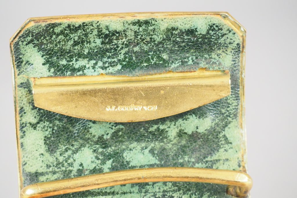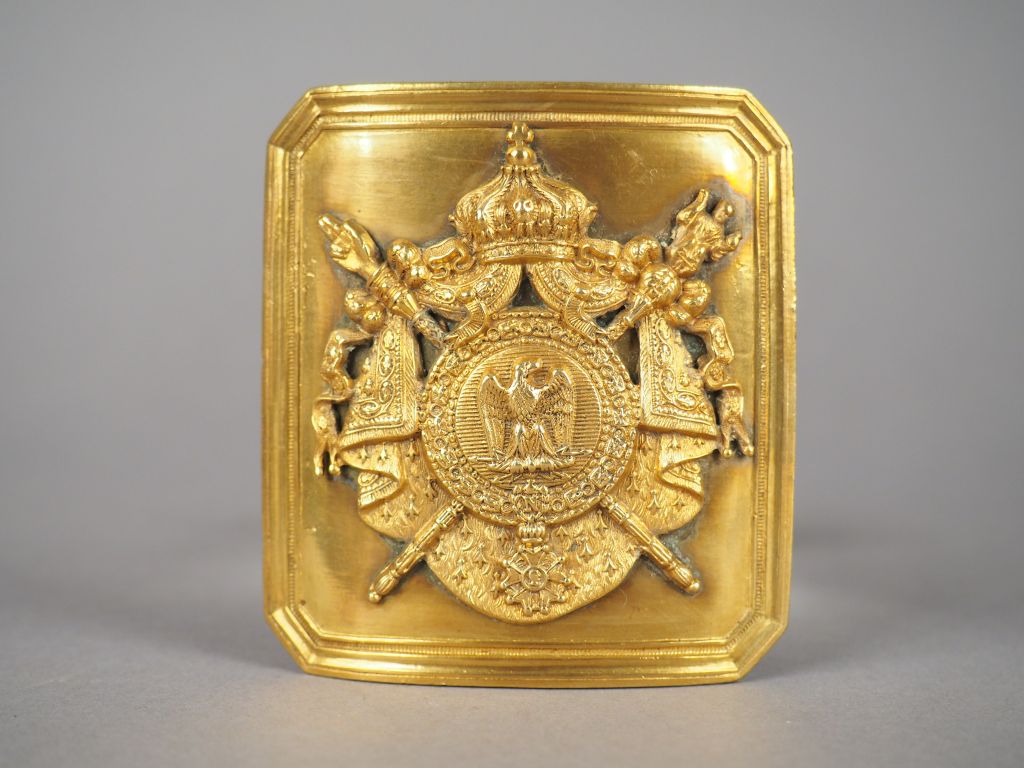 Belle plaque de ceinturon de cent-gardes, plateau rectangulaire à pans coupés de 657mm x 720 mm , au centre on trouve les grandes armes de la maison de l’empereur rapportées en bronze finement ciselé. Le dos est habillé d’une feuille de maroquin vert, crochet portant le nom du fabricant (J.L. Goufry cie). Large pontet en laiton. Etat 1