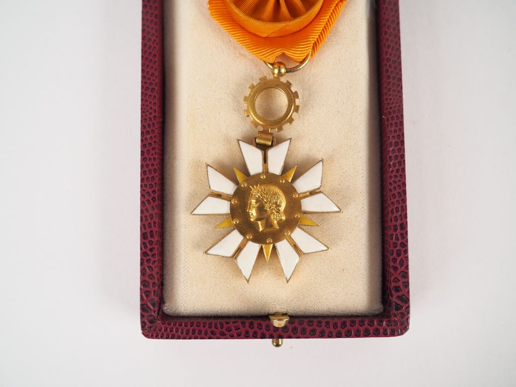 Boite contenant une étoile d’officier en bronze doré et branche émaillée blanc biface avec son ruban orange à bouffette de l’ordre de l’économie nationale. (Etat 1)