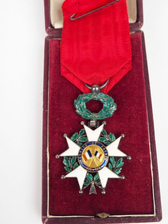 Boite en carton rouge sombre contenant une étoile de chevalier de la légion d’honneur (centres or) troisième république avec son ruban. (quelques éclats très infimes)