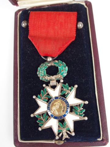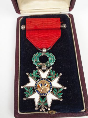 Boite en carton rouge sombre contenant une étoile de chevalier de la légion d’honneur (centre or) troisième république avec son ruban (Fabrication de qualité) 1