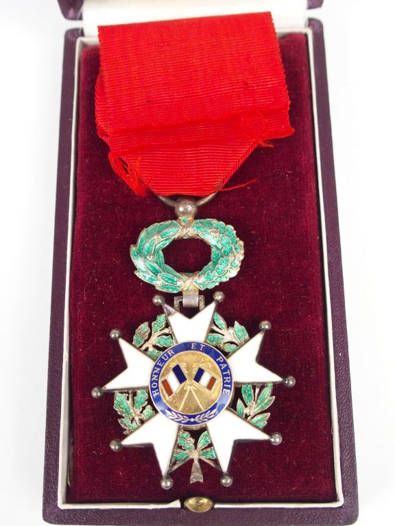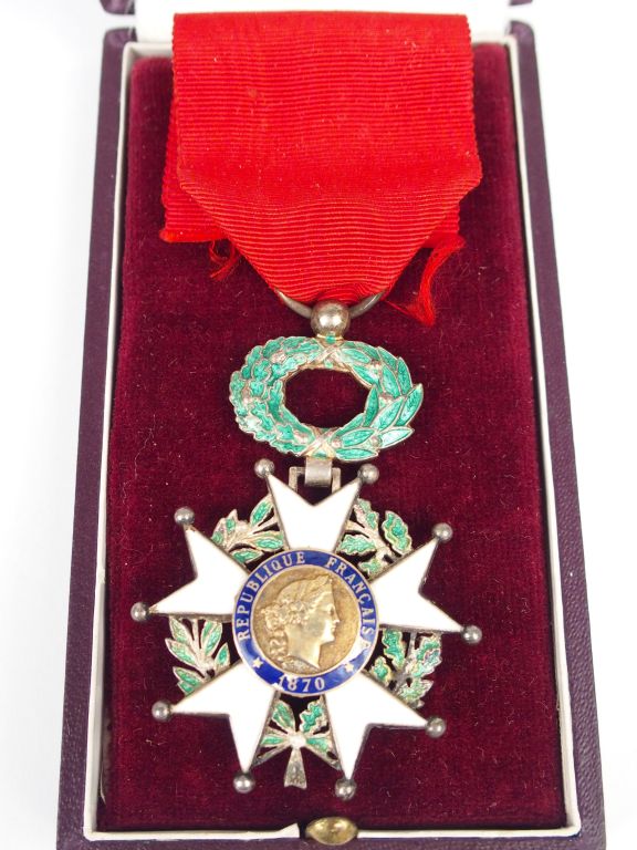 Boite en carton rouge sombre contenant une étoile de chevalier de la légion d’honneur centre or troisième république avec son ruban. (quelques éclats)