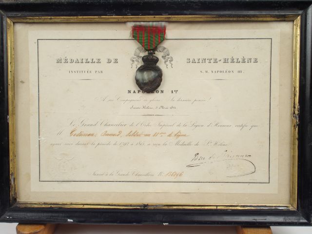 Cadre contenant un diplôme attribué à « Godinau Armand soldat au 81éme de ligne » et sa médaille dite de Ste Hélène, remise sous le régime de Napoléon III aux survivants des campagnes de 1792 à 1815. Cette belle médaille en bronze porte sur son avers la tête couronnée de Napoléon 1er dans une couronne de Laurier surmonté d’une couronne portant l’anneau de suspension. Au revers se trouve le texte « CAMPAGNES DE 1792 à 1815 » et au centre la phrase « A SES COMPAGNONS DE GLOIRE SA DERNIERE PENSEE ST HELENE 5 MAI 1821 »Ruban Vert à rayures framboise. 1
