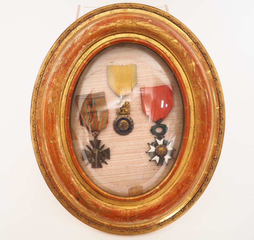 Cadre ovale en bois doré et verre bombé contenant une croix de guerre 14-18, une médaille militaire et une étoile de chevalier de la Légion d’honneur type 3ème République avec leur ruban insolés. Etat 2-.