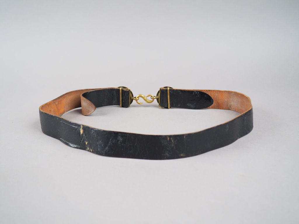 Ceinturon d’artillerie Troisième République, deux plateaux ronds en bronze doré, allégorie de l’artillerie avec deux canons croisés sur une pyramide de boulets, le tout surmonté d’une bombe flammée. Crochet serpentiforme, cuir brut, verso laqué noir brillant (coltar). Etat 1