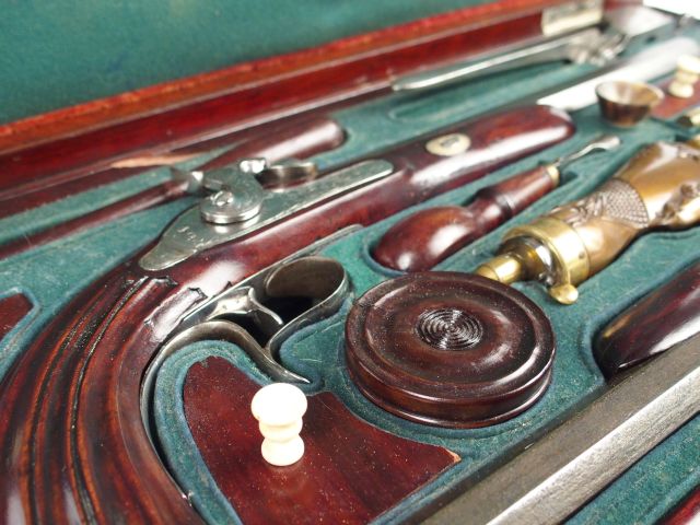 Coffret de pistolets de duel à percussion monté à la française et gainé de velours vert sombre. Coffret contenant outre les deux pistolets, un moule à balles, un maillet bois de chargement, un entonnoir en corne blonde, deux dosettes en laiton, une poire n poudre en cuivre en forme de crosse de fusil, un outil mixte tournevis/clef à cheminées, une boite à amorces en bois, une baguette de chargement et une baguette de nettoyage, enfin trois compartiments en bois à bouton d’ivoire complètent l’ensemble. Les deux pistolets à platine à l’avant sont montés fer, crosses renaissances en noyer choisi (revernies), canons rayés en damas. Coffret en plaquage de palissandre (1-).
