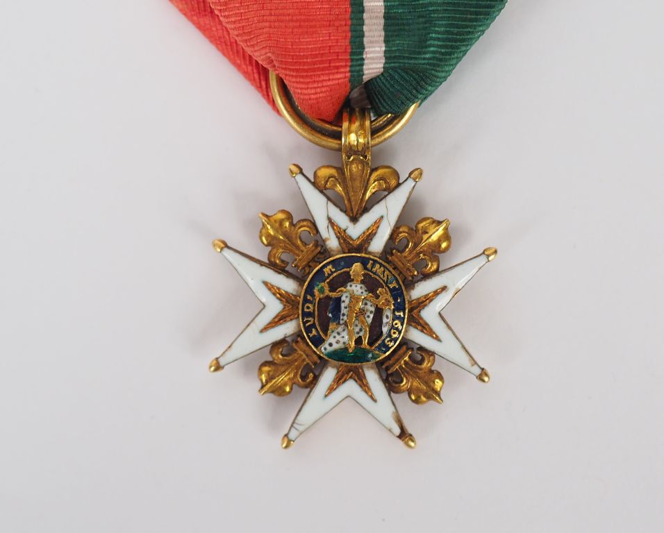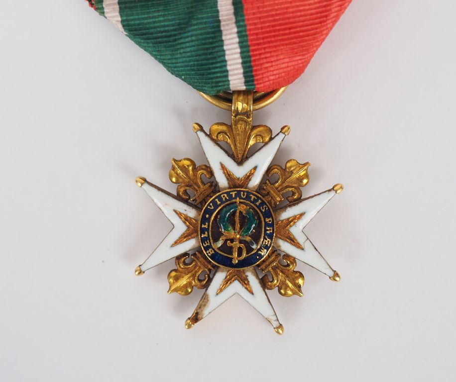 Croix de St Louis époque Restauration, taille 30mm x 30mm en or et émail, anneau cannelé épais, pointes non pommetées, fels à l’émail des branches à l’avers. (Fels discret et à l’ émail de la branche supérieure et infime fel à une branche basse). léger saut d’émail à une des branches inférieure au revers . Les deux centres sont en très bon état, croix sont avec son ruban moiré mixte rouge et vert à deux raies blanches en état superbe. (Etat 1-état neuf)