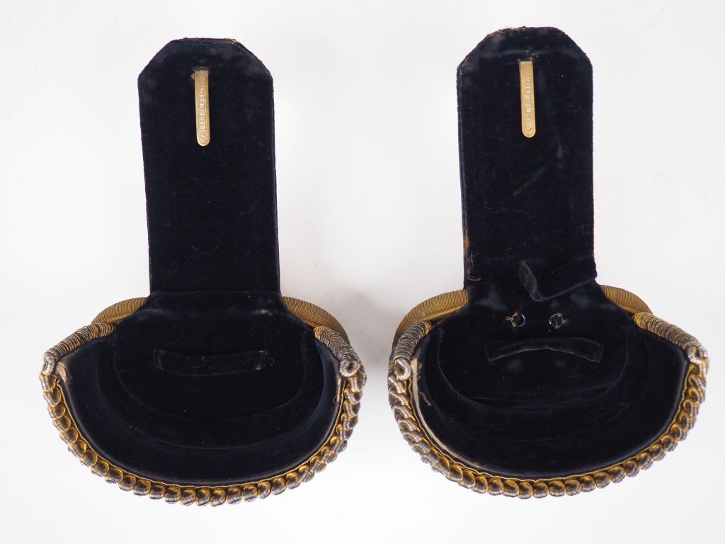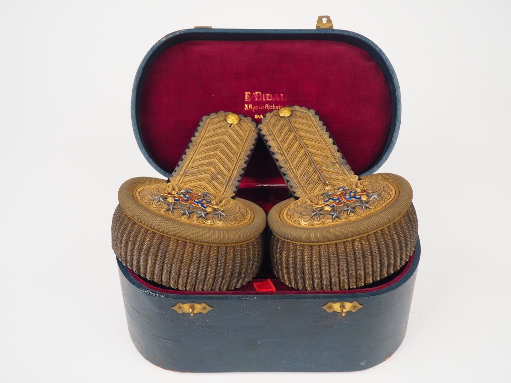 Dans une grande boite arrondie en molesquine vert Empire à garnitures (poignée et verrous) en laiton on trouve sur un lit de velours rouge sombre avec signature dorée dans le couvercle « BIDAL 3 Rue Richelieu Paris » une somptueuse paire d’épaulettes de maréchal d’Empire ayant appartenu au maréchal Elie-Frédéric Forey (1804/1872). Corps brodé à décor en bâtons en « V » alterné de chevrons inversés en filigrane doré, le tout encadré d’un feston sur fond de velours noir. Ecusson au bouclier surligné d’un semi de sequins doré brillant entouré d’une tournante unique dorée mat. Franges en grosse torsade captives dorées. Sept étoiles rapportées entourent (5 en bas 2 au-dessus) une paire de bâtons de maréchal polychromes noués par un ruban rouge construction en laiton doré et émail grand feu.