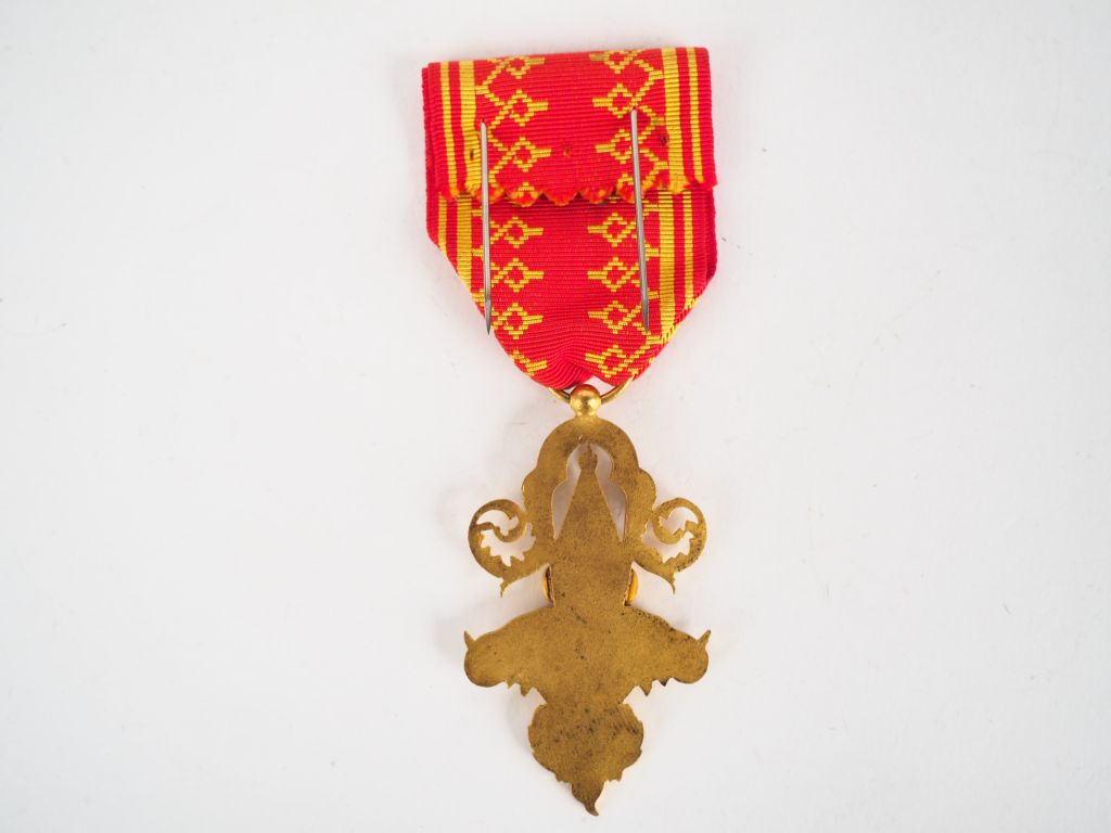 Décoration laotienne instituée en 1909 de l’ordre du million d’éléphants, module uniface en bronze doré et émail, ruban rouge avec raies jaune pâle et nœuds hongrois. (Etat 1)