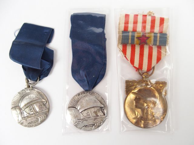 Décorations françaises commémorative 14/18 fabrication "Arthus-Bertrand" barrette engagé volontaire et rappel du ruban des blessé avec étoile rouge. Ruban rayé blanc et rouge, on y joint deux commémoratives départementales (Ariège et Yvelines)(11/11/18-11/11/68).1