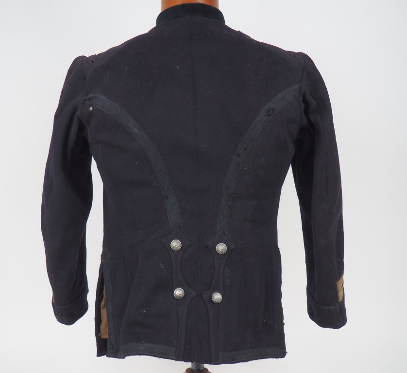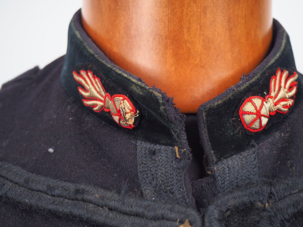 Dolman-pelisse en drap noir, d’officier des sapeurs-pompiers, col noir à la grenade surlignée de rouge, face avant de l’habit ornée de brandebourgs noirs, boutons blancs à la grenade marqués « Sapeurs-pompiers » et 2 galons de bas de manche. Léchures de mites et trous. Etat 2-.