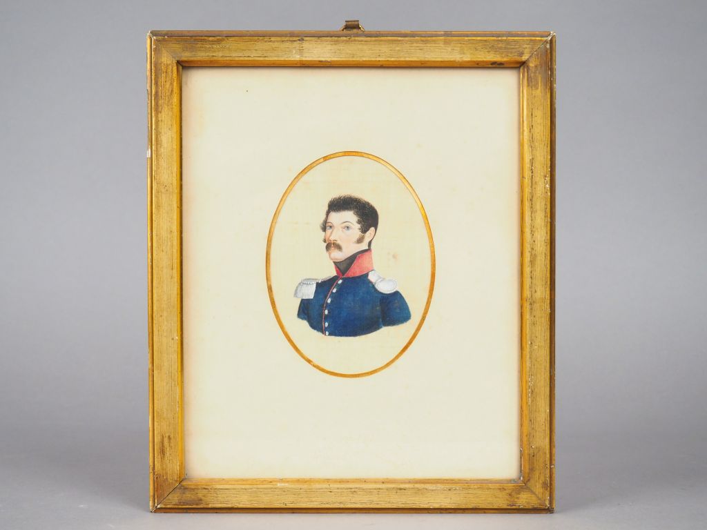 Ecole française XIXème « Portrait d’officier » Peinture sur soie en médaillon. Dim. à vue : 12.3 x 9 cm