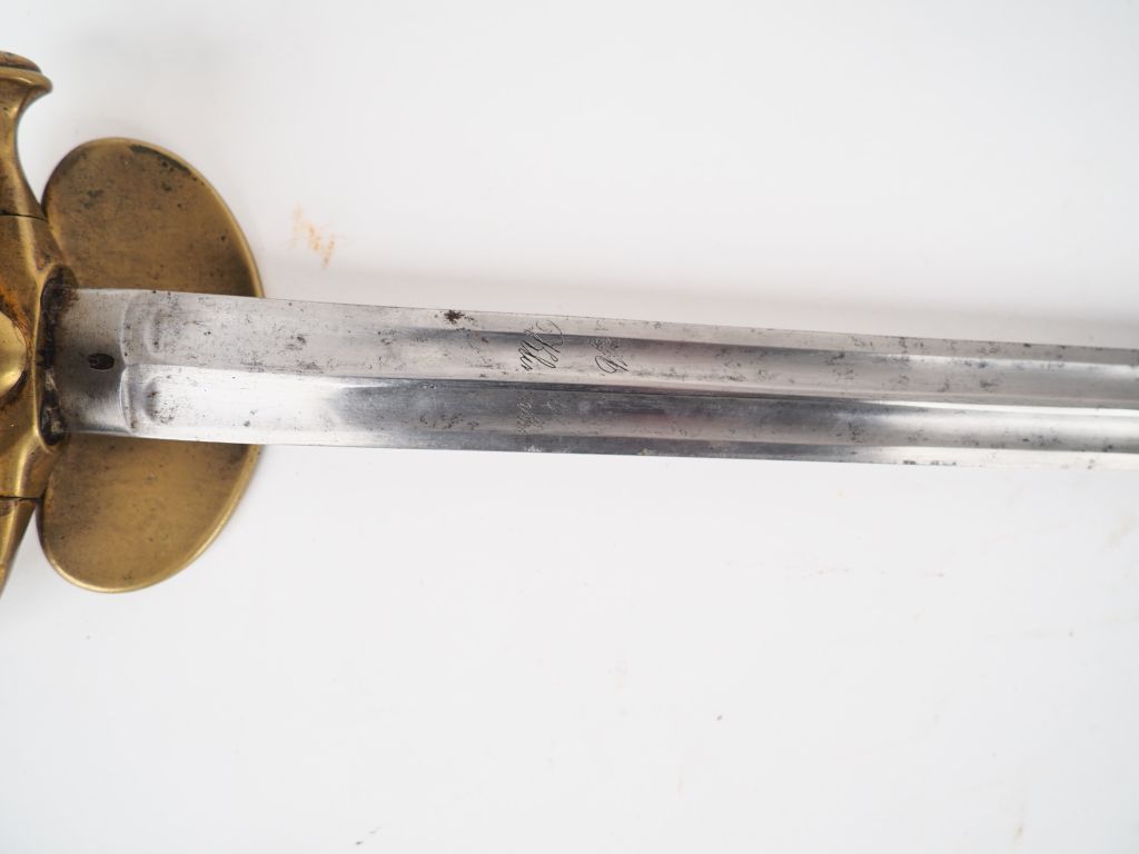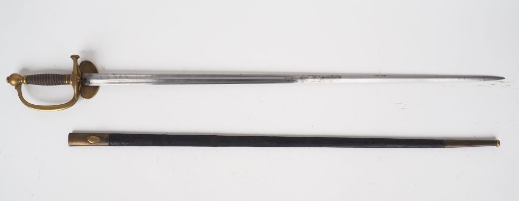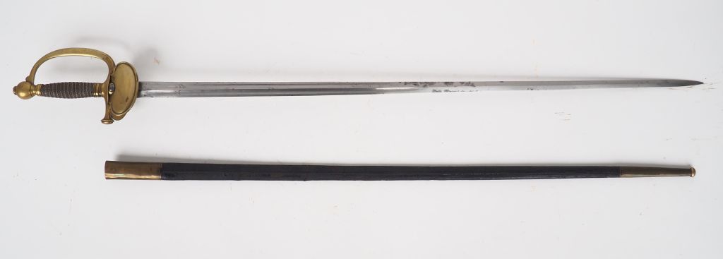 Epée à clavier d’officier Second Empire, lame droite symétrique à 4 pans creux, signée Couleaux Frères à Klingenthal. Monture en bronze fondu, calotte ronde à rivure proéminente, plateau principal à l’aigle impérial dextrogyre non couronné, plateau secondaire rabattable, dans son fourreau cuir à 2 garnitures laiton. Etat 1-.